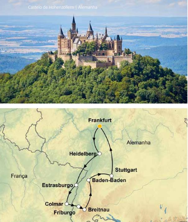 Café da manhã. Viagem ao Castelo de Hohenzollern, onde o tempo parece ter parado. Localizado no topo do Monte Hohenzollern, oferece uma vista quase tão espetacular quanto o próprio desenho do castelo. Continuação pela Rota Alta da Floresta Negra, uma das mais belas rotas turísticas da Alemanha. A partir desta rota, terá belas vistas do Vale do Reno, passando por lugares espetaculares, como o Lago Mummel. À tarde, chegada a Baden- -Baden, onde terá tempo livre para desfrutar dos banhos termais da cidade ou tentar a sorte no casino. Hospedagem.